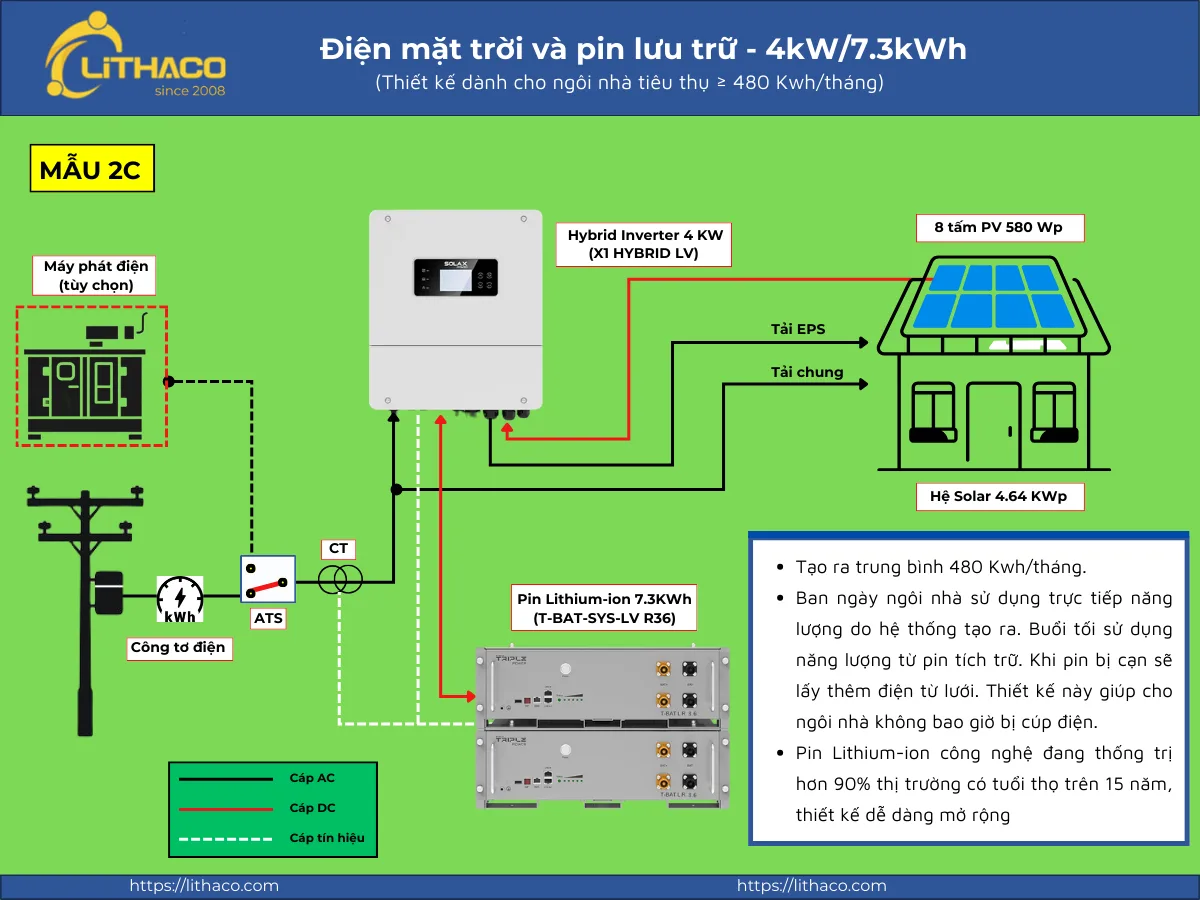 Hệ thống điện mặt trời có lưu trữ 4kW/7.3kWh của LITHACO bao gồm các thành phần chất lượng cao như tấm pin mặt trời, biến tần hybrid, pin lưu trữ lithium-ion và các thiết bị điều khiển, giám sát khác. Tổng chi phí lắp đặt hệ thống bao gồm cả thuế VAT và chi phí lắp đặt, vận hành.